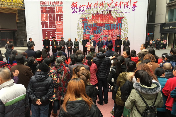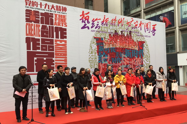 为深入学习宣传贯彻党的十九大精神,把十九大精神全面落实到重庆大地上,1月19日下午,由中共重庆市委宣传部、重庆市文学艺术界联合会共同主办,重庆市美术家协会、 、中共重庆市沙坪坝区委联合承办的“艺绘新时代,共筑中国梦——党的十九大精神主题创作展”,在重庆沙坪坝区文化广场隆重开幕。