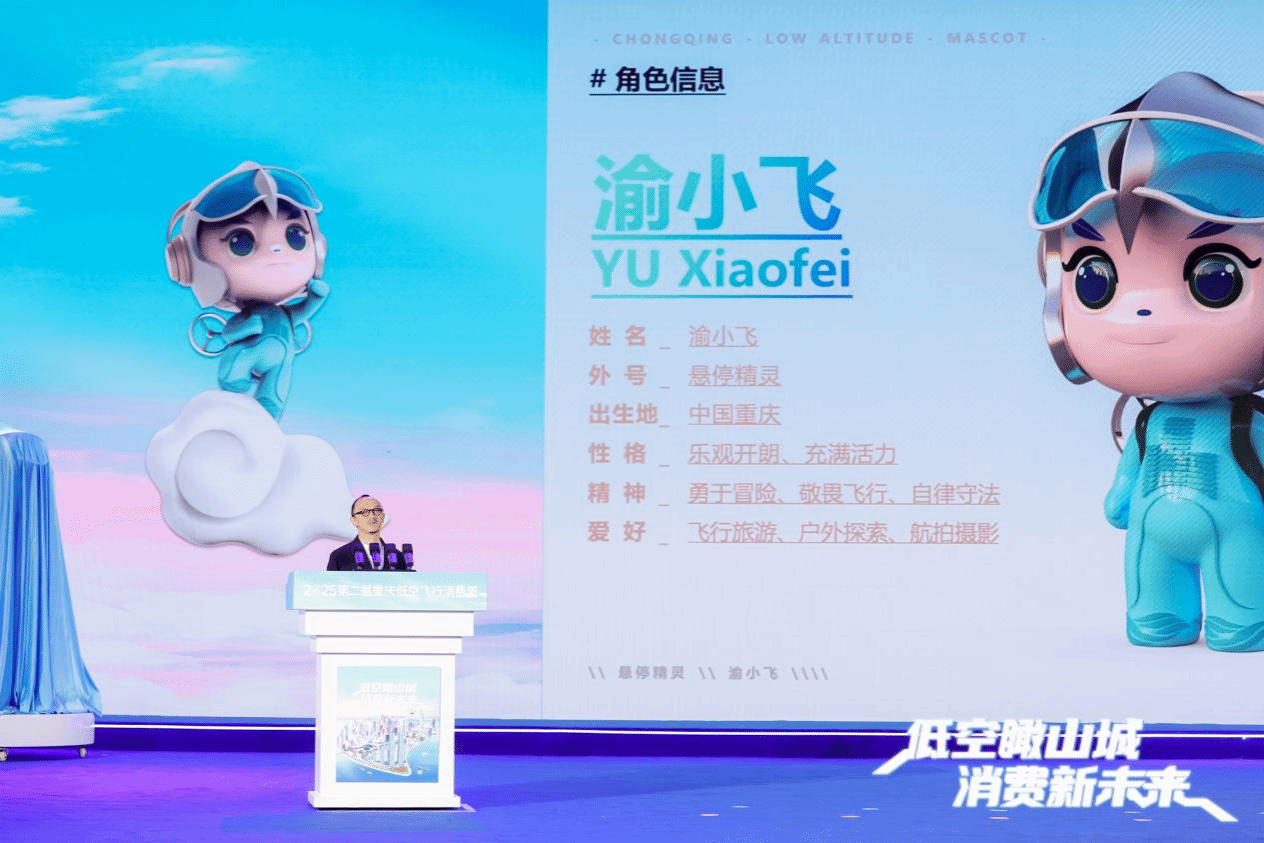 “渝小飞”又名“悬停精灵”,以蜂鸟为原型创作,外观造型以现代科技元素为核心,结合重庆的自然风貌,融合了山水之城的灵动与飘逸,打造出一个既具有未来感又不失地域特色的形象。它身着浅蓝色飞行服,头戴蜂鸟式流线型头盔,肩背eVTOL低空飞行器,胸前为山字形太阳能光伏板,脚部嵌有两江交汇纹饰,形体呈现出一种自由翱翔、勇往直前的姿态。作为一座“智造”强市和设计之都,年轻的“渝小飞”凝结展现其坚韧、忠勇、开放、争先的城市精神,也寓意着人与自然和谐共生的美好愿景。
