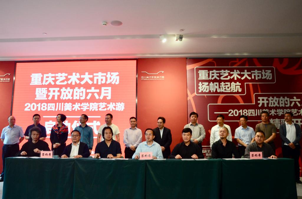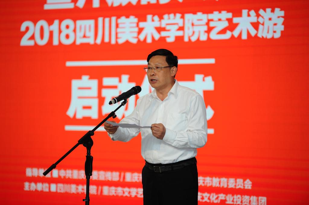 5月27日下午,由中共重庆市委宣传部、市文化委员会、市教育委员会指导, 、重庆市文学艺术界联合会、重庆文化产业投资集团联合主办的“重庆艺术大市场暨开放的六月——2018 艺术游”启动仪式在 美术馆举办。市委常委、宣传部长张鸣,市委宣传部副部长、市文化委主任张洪斌,重庆文投集团党委书记、董事长陈余莉,市教委专职督学邓沁泉、市文联副主席龙川、中国电子科技集团公司董事、党组副书记胡爱民、沙坪坝区区委常委、区委办主任、宣传部长陶世祥,以及莅临我校开展本科教学工作审核评估的教育部专家、山东艺术学院美术学院副院长唐鸣岳教授、浪尖设计集团有限公司董事长兼总裁罗成先生,中央和重庆新闻媒体界、有关部门负责同志和师生代表参加启动仪式。学校党政领导出席启动仪式,启动仪式由党委书记黄政主持。市委常委、宣传部长张鸣宣布了“重庆艺术大市场暨开放的六月——2018 艺术游”正式启动。