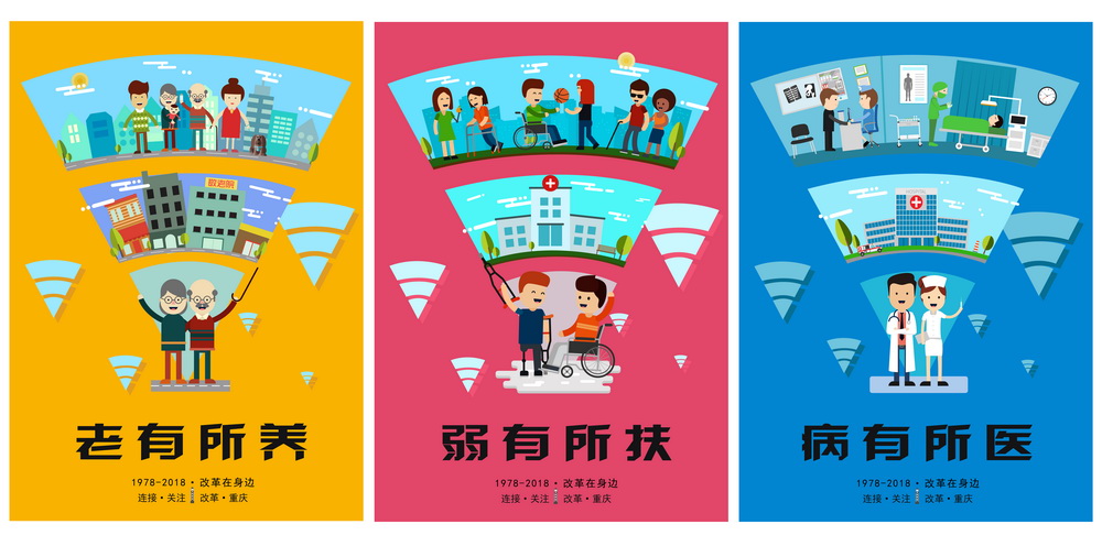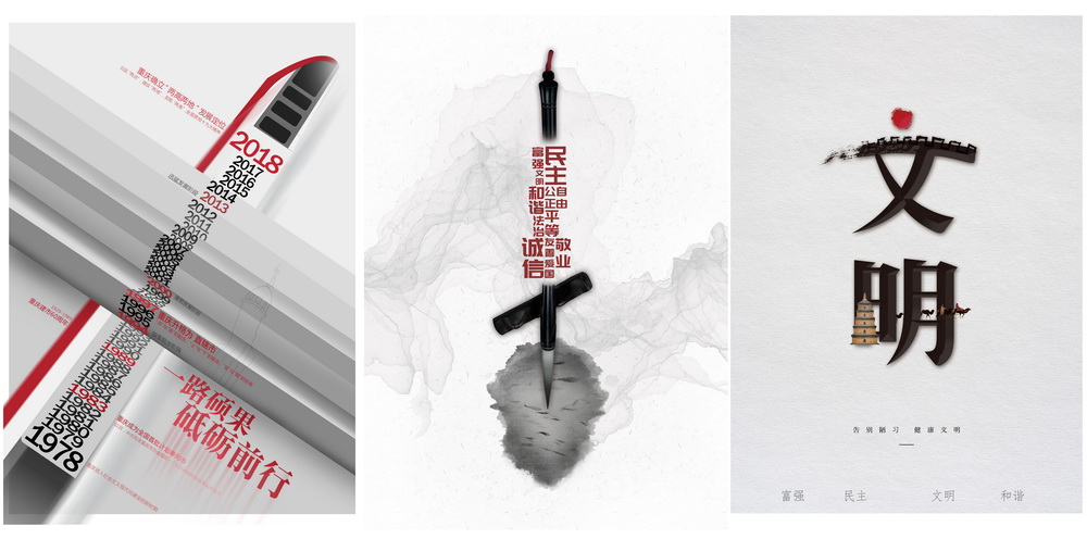 美术教育系2015级平面设计专业刘梦婷通过《改革在身边》系列海报,描述重庆在改革开放中,逐步建立、发展和完善社会保障制度,逐步做到老有所养、弱有所扶、病有所医。影视动画学院2016级戏剧影视美术设计专业张玉琳、朱乔的视频广告作品《重庆——四十春秋》,通过新老重庆的对话,讲述重庆变革之路。书写着城市的发展与进步,凝聚着中国力量。展现出当代中国人的奋斗精神与爱国情怀。
