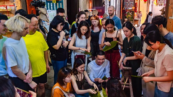 6月8日,英国青年艺术家与实验班的师生先后来到中山古镇采风,为艺术创作收集素材。6月9日清晨,实验班师生以及英国艺术家参与了古镇组织的包粽子大赛,同学们向英国艺术家介绍了屈原的故事、包粽子的习俗等“端午节”传统,引发国外友人的极大兴趣。