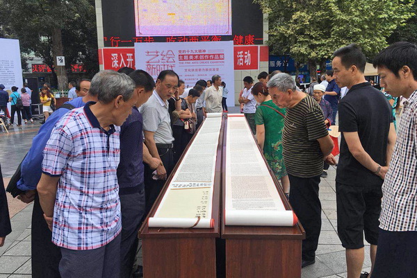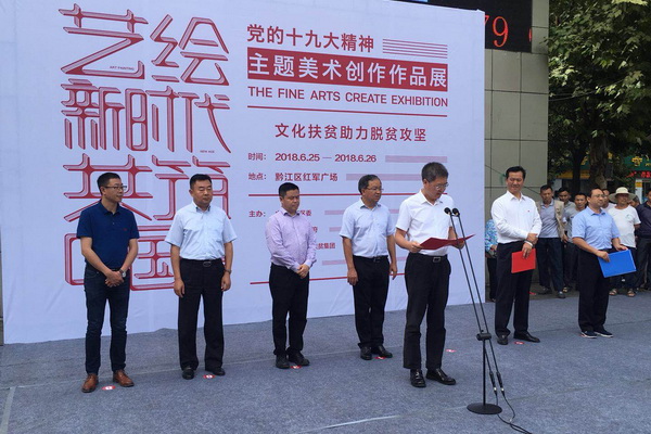 6月25日上午,由黔江区委、市卫生计生委扶贫集团和 联合举办的“艺绘新时代,共筑中国梦”主题创作展开幕式在黔江红军广场举行。余长明宣布展览开幕,黄政、刘桂根分别致辞,庞茂琨、张志坚等出席开幕式。开幕式由彭林权主持。 向黔江区授予“ —黔江区金溪镇创作写生实践基地”牌匾,并向黔江区赠送了一批主题创作作品。此次展览还将在黔江区金溪镇展出。