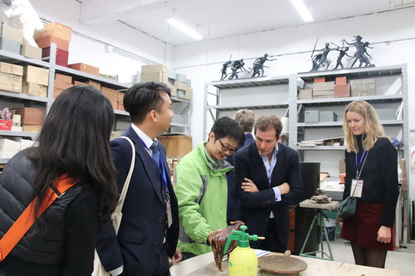 金秋十月,川美的校园银杏挂果,丹桂飘香。以中国人民外交学会副会长梁建全、法中基金会创始人卢力捷为代表的一行均盛赞了川美美丽校园、艺术家驻留计划和美术馆展览,还热情赞扬了拔尖班同学们的英文水平,让他们觉得非常生动和温暖。对收租院群雕制作的详细解说,也让他们了解了川美的辉煌历史。