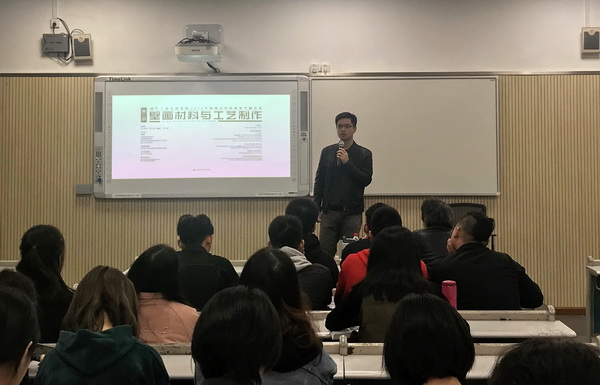 刘凯首先对往届全国美展入围作品进行了归纳性赏析,按照材质及工艺划分为架上、漆画、浮雕、纤维及综合材料几大类别,并就各个类别深入分析,为壁画研修班的学员提供了良好的创造参照和创作方向。通过对《文明的页岩——不朽之魂》磨漆画、北京地铁4号线动物园站壁画以及北京地铁6号线北运河西站壁画等当代公共艺术的代表作品在创作过程及工艺制作上的讲解和剖析,为研修班学员提供了更加广泛的创作思路和更具有实践价值的制作工艺。讲座从壁画创作的实践案例出发,结合大量现当代壁画作品,分别探讨了壁画创作材料的多元性划分及其特殊属性,以及各种壁画创作技法的具体实现性和差异性。