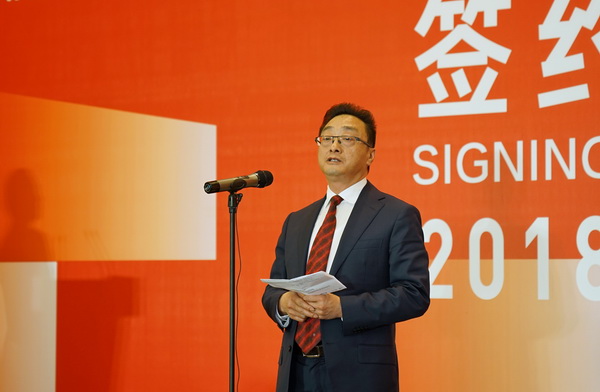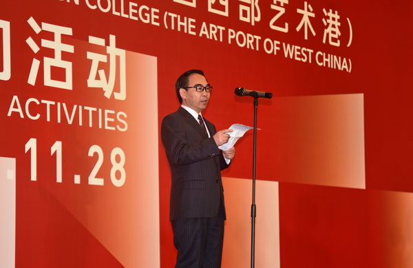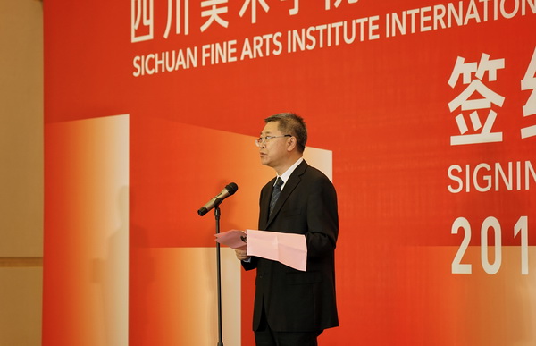 市委教育工委委员、市教委副主任邓睿讲话。他指出, 国际设计学院的建设是在习近平新时代中国特色社会主义思想和党的十九大精神的指引下,全面贯彻落实习近平总书记在全国教育大会上的讲话精神和对重庆提出的两点定位、两地两高目标和四个扎实的具体体现,是加快实施扩教兴市和人才强市的行动计划的具体举措,我们倍感振奋。他提出:第一,希望高规格规划建设学校的园区;第二,希望川美抓住大好时机,以党的十九大的精神为指导,依托两江新区和悦来新城,建设具有国际影响力的一流学院,一流学科,一流教师团队,一流教学体系,培养出一流人才,出一流成果,为重庆高等教育“双一流”建设再立新功,再创辉煌;第三,希望两江新区和悦来投资集团不改初衷,不忘初心,一如既往地关心支持川美的建设和发展,市委教育工委、市教委将密切关注、大力支持 国际设计学院的建设与发展。