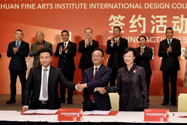 签约仪式上,我校庞茂琨校长与两江新区秦淑斌、悦来投资集团王菊梦共同签署了 国际设计学院(中国西部艺术港)项目合作协议。邓睿、罗勇、黄政、陈方兰、石键、左益、陈林、张杰、侯宝川、苟欣文、焦兴涛上台共同见证了这一重要时刻。