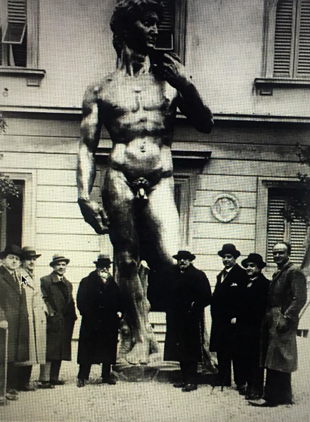 (翻制《大卫》雕像的意大利百年家族约五十年前与雕像复制品的合影)