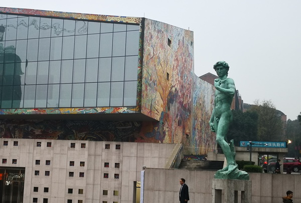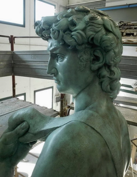 安放在 美术馆大门左侧的这尊《大卫》雕像,是由意大利从事传统雕塑修复的百年家族企业用原作原模翻制而成,该家族企业从事雕塑作品专业修复与复制已有约300年历史,本次使用的原作模具始于1910年翻制佛罗伦萨米开朗基罗广场中央《大卫》雕像复制品时用到的模具,已有108年历史。我校的这尊《大卫》雕像高5.5米,基座高1.88米,重1200公斤,其青铜的材质和尺寸都与佛罗伦萨米开朗基罗广场中央的《大卫》雕像完全一致。