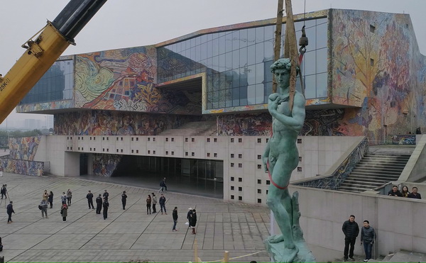 (《大卫》雕像在川美吊装现场)