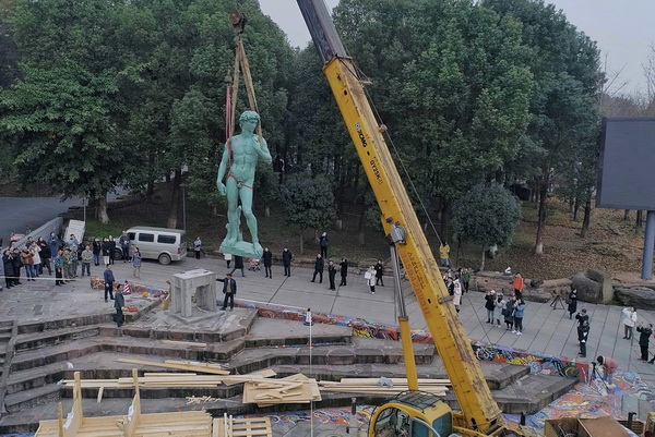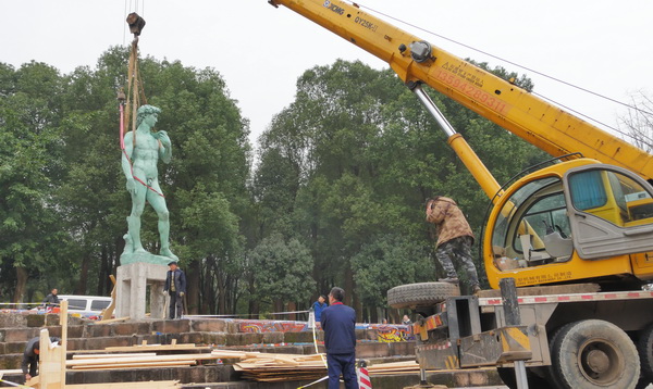 (吊装完成的《大卫》雕像)