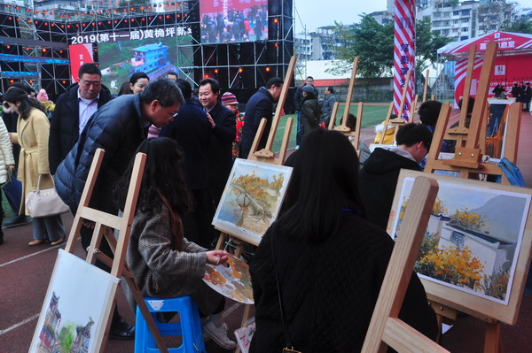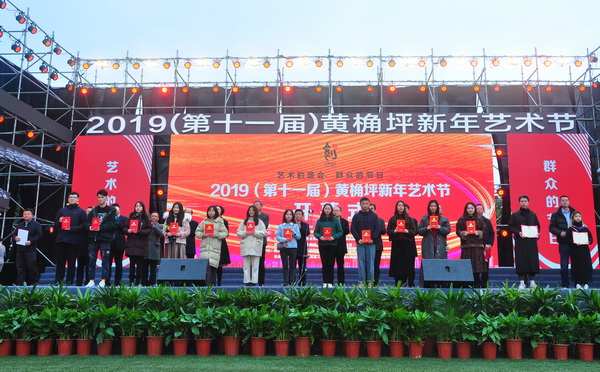 开幕式上,出席领导为 “我为黄桷坪校区点赞”大赛优胜奖获得者颁奖。九龙坡区文化委员会、重庆美电传媒有限公司、维尔德(重庆)影视有限责任公司、重庆银美影业有限公司、重庆世欣九腾文化产业发展有限公司等单位举行文化产业招商引资签约仪式,推动文化创意产业的更大发展。最后,曾维伦宣布2019(第十一届)黄桷坪新年艺术节正式开幕。