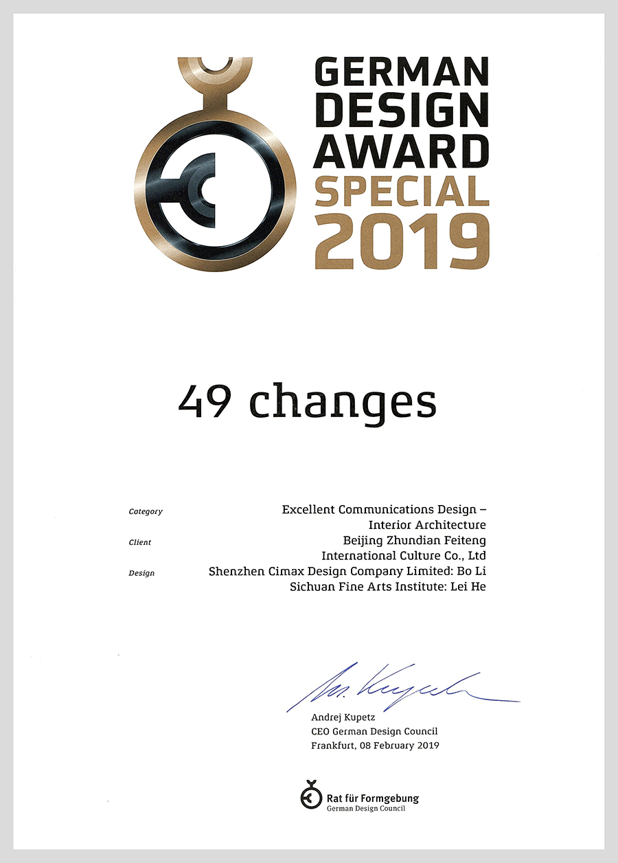 2019年2月8日,被国际业界誉为设计奖中奖的德意志联邦共和国设计奖German Design Award,在法兰克福举行了盛大的颁奖典礼。我校公共艺术学院教师何蕾作为软装陈设设计及执行人,与我校公共艺术学院客座教授、深圳羲玛设计首席设计师郦波共同完成的项目《49 CHANGES》,在激烈的竞争中脱颖而出,喜获该项顶级国际设计奖殊荣。