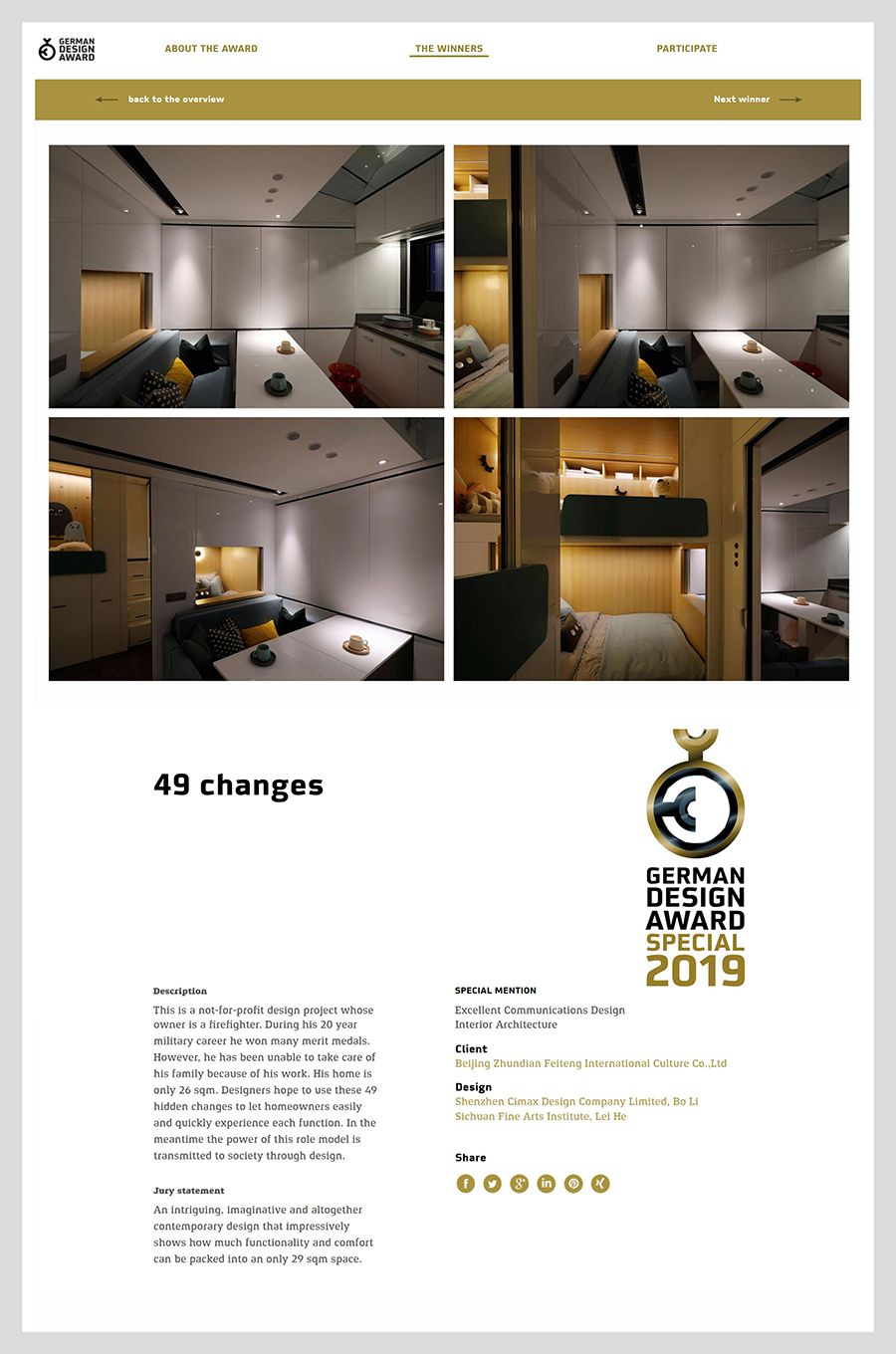 我校本次获奖作品《49 CHANGES》是一个电视公益设计项目,除了在14天的时间里出色地完成了设计和施工,挑战仅有26平米极限空间,在最短的时间里快捷轻松地实现49个变化。更重要的是,这是一个充满温度的设计,它向整个社会传递了榜样的力量,以及人与人之间的爱与被爱。《49 CHANGES》在去年6月喜获提名后,历经近半年的激烈角逐,最后摘得这枚珍贵的GERMAN DESIGN AWARD SPECIAL大奖标章。