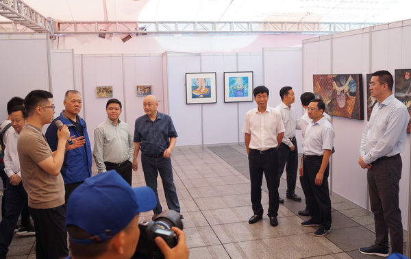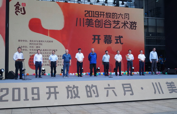 6月10日上午,“开放的六月-川美创谷艺术游”活动在九龙坡区杨家坪步行街文化广场盛大开幕。重庆市文化和旅游发展委员会巡视员席华, 院长庞茂琨,九龙坡区人大常委会主任、党组书记胡奇明,重庆市文投集团副总裁程锋, 副院长张杰,中共九龙坡区委常委、宣传部部长颜朝华, 副院长彭林权,九龙坡区人民政府副区长李洪亮,九龙坡区政协副主席范国明,九龙坡区政协副主席郭晏麟等领导和嘉宾出席了开幕式。开幕式由我校党委副书记左益主持。
