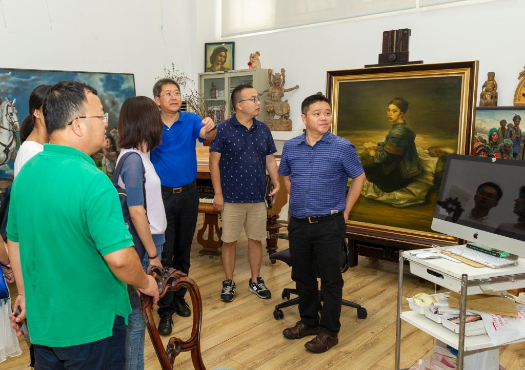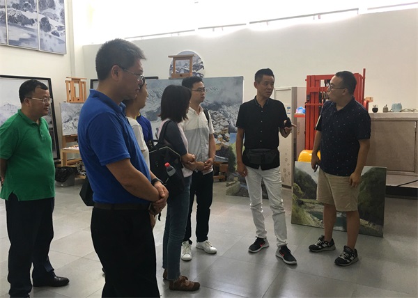 在老院子,黄政、左益与人民日报一行亲切交谈,向他们介绍了学校的发展历史、办学成就、校区建设、师资队伍建设等方面情况,随后陪同参观了美术馆的收租院陈列展和馆藏展。在虎溪公社庞茂琨工作室、翁凯旋工作室,黄政、庞茂琨、左益、翁凯旋向人民日报一行介绍了我校组织师生到深度贫困乡巫溪天元乡开展写生创作的情况,品鉴了两位艺术家深入天元乡绘就的展示美丽乡村建设成果的风景写生作品。