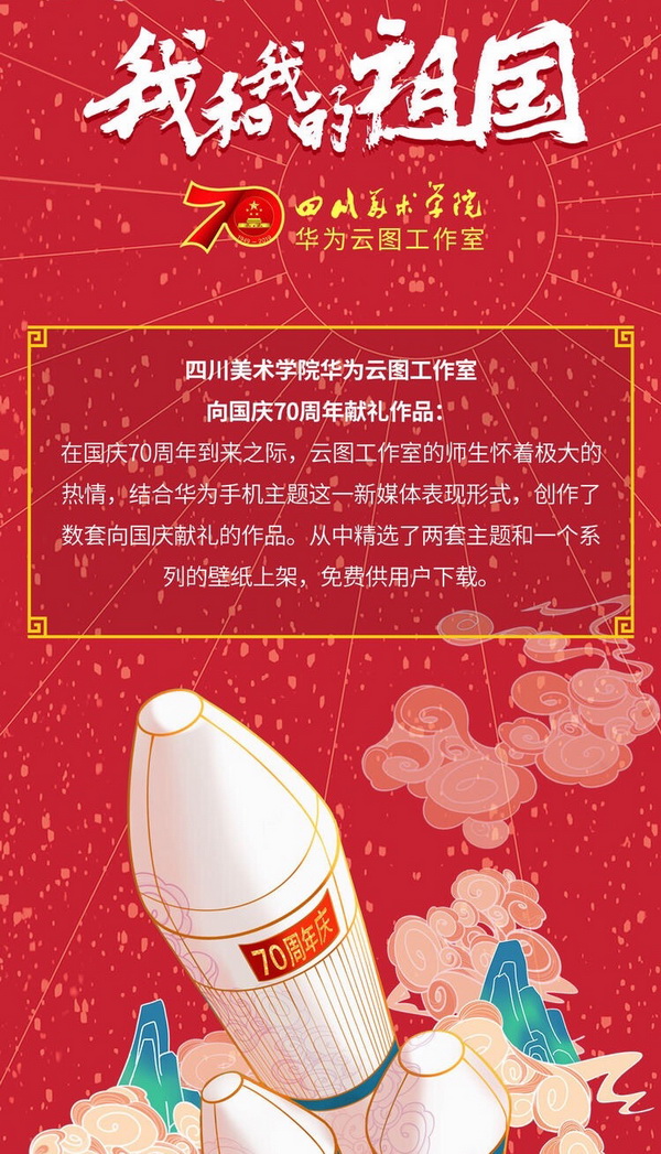 在国庆70周年到来之际,华为软件技术有限公司和 设计学院联合的川美华为云图工作室正式发布为新中国成立70周年献礼的手机主题。设计学院师生和开发人员紧密协作,结合华为手机主题这一新媒体表现形式,创作了数套向国庆献礼的作品,并从中精选了两套主题和一个系列的壁纸上架,免费供用户下载。
