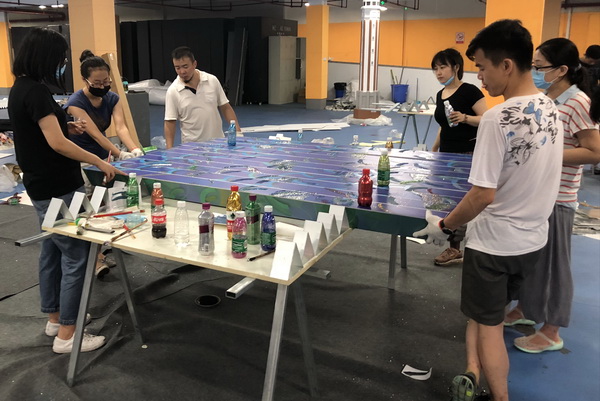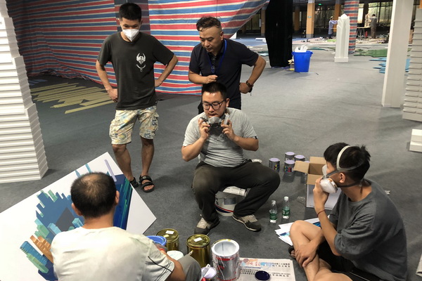 黄政书记多次参加彩车项目专题会议,要求学校举全力配合彩车项目的开展,同时担任临时党支部书记,要求把彩车设计制作工作作为一项重要政治任务来抓;庞茂琨校长担任重庆市彩车创意设计专家组组长,组织市内知名艺术家、专家学者出主意、想办法,确保创意设计的艺术性水准;主创成员段胜峰负责把控整个项目的进度,事无巨细对接各个合作方,并参与技术难题攻关;主创成员周小波全程对细节精益求精,容不得半点马虎,一点点的颜色偏差都要亲自去反复调整,制作上遇到难题时跟着大家一起想办法、找材料、亲自动手做;主创成员汪泓提供了基础设计方案,同时承担平面设计工作;青年教师杨呈颖肩负3D建模重任;研究生们跟着导师参与相关设计工作;漆画等相关专业师生也积极配合。