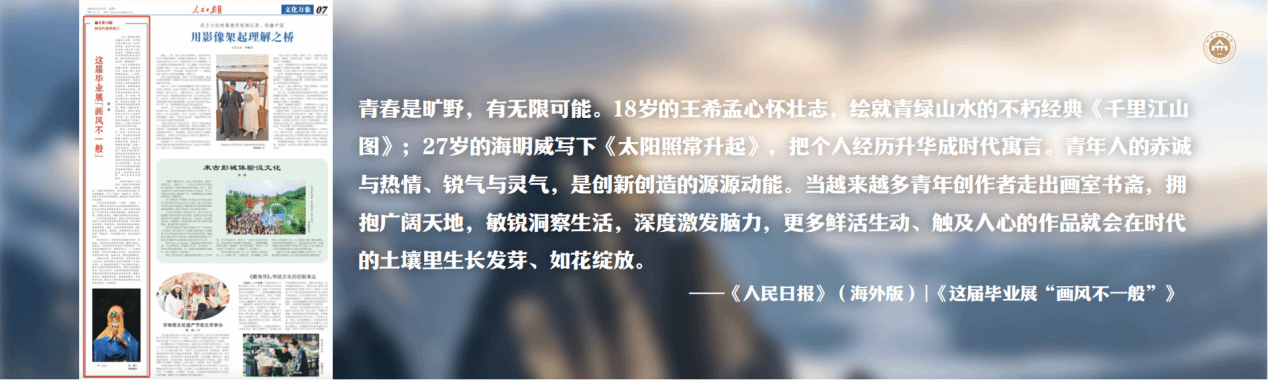 “18岁的王希孟心怀壮志,绘就青绿山水的不朽经典《千里江山图》;27岁的海明威写下《太阳照常升起》,把个人经历升华成时代寓言。青春是旷野,有无限可能。”——这是《人民日报》专栏文章写到今年以川美为代表的全国艺术院校毕业展时的评价。自古英雄出少年!你们做到了!我深深地为你们自豪!