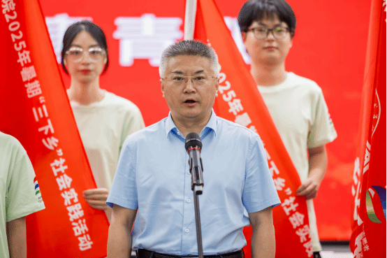 唐青阳为校级重点团队授旗,并宣布2025年暑期“三下乡”社会实践活动出征。