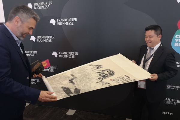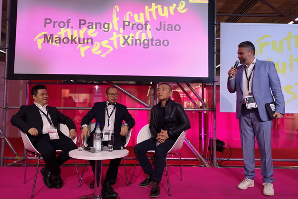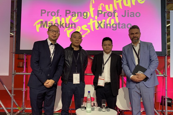 10月17日, 我校代表团又受到法兰克福国际书展副总裁Volland(富兰德)先生的邀请,来到了法兰克福的国际书展现场。在展会现场,庞茂琨校长、焦兴涛副校长同富兰德先生以论坛形式讨论了新媒体以及数字艺术在当代艺术的重要性。