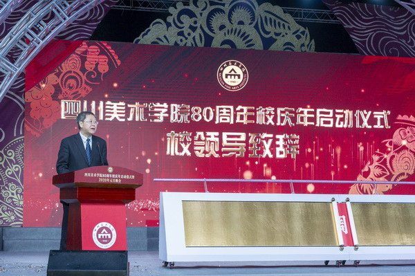 党委书记黄政为80周年校庆年启动致辞,代表学校党委行政向各位来宾、社会各界人士、离退休老同志、全校师生、全体校友表示衷心的感谢和亲切的问候。黄政指出,1940年,在抗战烽火岁月中,一批怀抱教育救国的艺术教育先驱毅然回国,在成都创立四川省立艺术专科学校, 背上行囊,从这里出发。伴随着人民共和国的成立,西北军政大学将艺术火种撒向西南,从设立的西南人民艺术学院到西南美术专科学校再到1959年5月26日正式设立的 ,学校筚路蓝缕、砥砺前行,回顾80年的发展历程,我们可以深切地感受到川美的发展总是和国家民族的命运紧紧联系在一起,国家兴、川美兴,民族盛、川美盛。正是在国家、民族发展和需要中,川美铸就了以培养担当民族复兴大任时代新人的家国情怀,涵养了以人民为中心的独特文化气质。