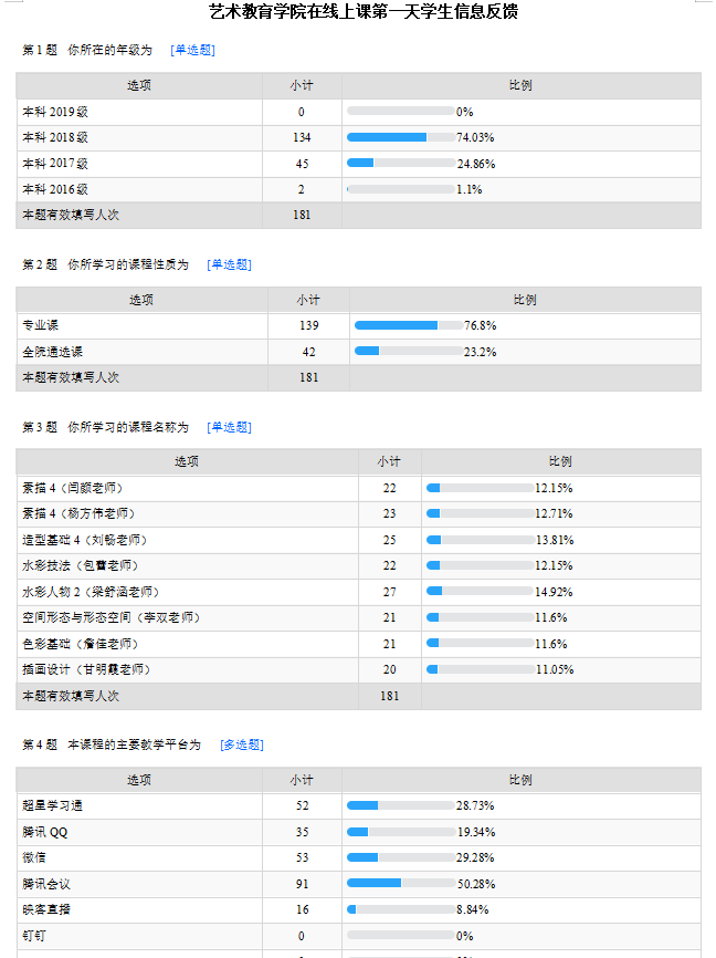 四是加强网络化的教学质量管理。校院两级教学督导共同开展在线教学质量评价,校级督导15人,主要以网络听课尤其是看课的形式,对106门课程的运行情况进行了跟踪监测。二级督导132人,对所属单位所有课程进行了点对点的跟踪指导。各单位通过调查问卷或网络咨询等方式,及时了解学生对教学运行和教学组织的反馈意见,并针对性地进行了调整。其中,艺术教育学院在开学第一天和开学第一周结束时分别通过“问卷星”向所有参与课程的学生进行了问卷调查,及时搜集学生意见,调整教学方式和手段,取得了很好的效果。