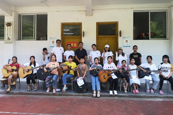 在天元乡天元中心小学,天元村的驻村扶贫队员李申平老师正在给小学生们教授吉他课。他发挥自己的业余特长,在天元乡自费开办了公益吉他培训班,把扶贫与扶智、扶志相结合起来,用文艺传递爱,用音符播撒美的种子。实践队员在李老师的协助下,与小学生们即兴开展了“大手牵小手,为青春欢唱”活动,实践队员、四川美院校学生会、大学生艺术团的大学生与小学生们共同演唱了校园民谣,并为他们表演了精美的舞蹈,在一曲充满不舍之情的“送别”合唱歌声中,小朋友们露出了欢快的笑容。