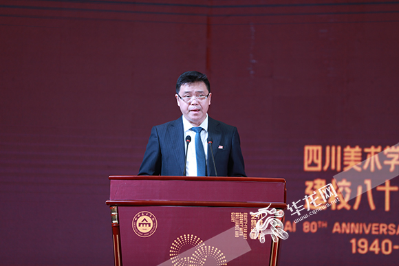 开幕式上,校长庞茂琨回顾了川美80年奋斗历程,勉励当代川美人继续奋进。在 80年发展过程中,川美涌现了一批具有影响力的艺术家和艺术品。期间, 培育了叶毓山、罗中立、何多苓、高小华、周春芽、张晓刚等为代表的一批又一批艺术名家,创作了《收租院》《毛主席纪念堂毛泽东汉白玉坐像》《父亲》《大家庭》《苹果熟了》《列焰青春》为代表的多批艺术经典作品。