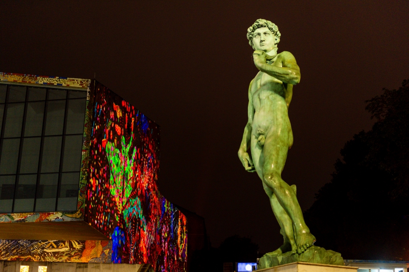 最后,毕岚祺、庞茂琨共同点亮了大卫雕像。我校定制的这尊大卫雕像高5.5米,基座高1.88米,重1200公斤,其青铜的材质和尺寸都与意大利佛罗伦萨米开朗基罗广场中央的大卫雕像完全一致,使用的也是1910年翻制佛罗伦萨米开朗基罗广场中央大卫雕像用到的原作模具。这个雕塑曾经代表了欧洲文艺复兴时期艺术的最高成就。随着灯光的点亮,这尊雕像在川美80周年校庆这个喜庆的日子里,焕发出了更加迷人的、新的光彩。