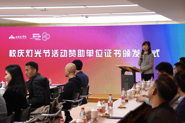 10月27日,我校在黄桷坪校区举行校庆灯光节活动赞助单位证书颁发仪式。党委书记唐青阳、副院长张杰出席了仪式。34家校庆灯光节活动赞助商代表、我校公共艺术学院领导及照明艺术设计教师与学生代表共同参加了颁发仪式。仪式由公共艺术学院副院长魏婷主持。