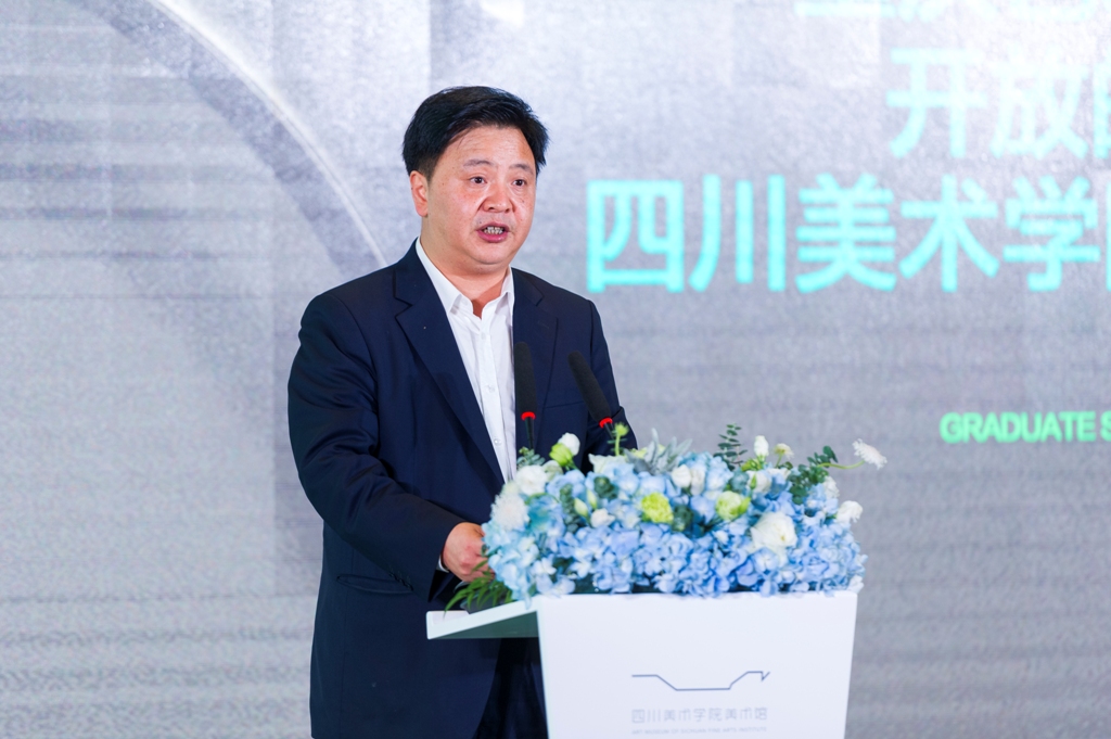 重庆市教委副主任温涛发表讲话。他指出, 作为一所在重庆高等教育版图中独具特色的学校,始终以“出作品、出人才”为重庆建设西部地区教育高地增光添彩。特别是 已经持续举办了十七年的“开放的六月”艺术游活动,切实丰富了市民文化生活,推动了重庆城市文化建设,成为重庆人民的盛事,成为重庆教育界的骄傲。他提出,艺术教育在社会主义文化发展和建设高质量教育体系的进程中发挥着至关重要的作用, 作为重庆市艺术教育的排头兵,要勇担培育艺术英才、强化艺术研究、开放艺术资源、普及审美教育、促进文化交流的重任,力争早日建成国内一流、国际知名的高水平美术学院。