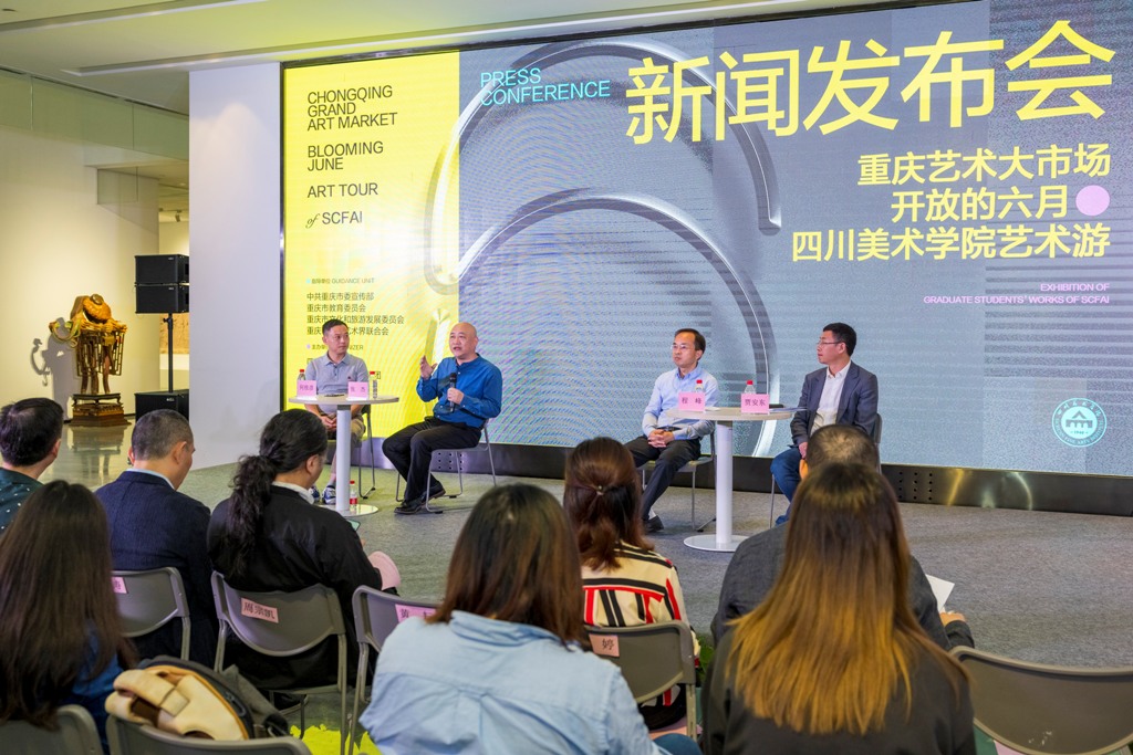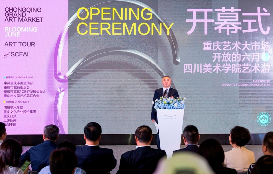 六月风光好,不与四时同。6月3日,深受全校师生和广大市民期待的年度文化艺术盛事:“重庆艺术大市场-开放的六月—— 艺术游”2021毕业生作品展,在 美术馆和上游新闻客户端同时开幕。本次活动由重庆市委宣传部、市委教育工委、市教委、市文化和旅游委、市文联指导, 与重庆文化产业投资集团、重庆日报、上游新闻、融创中国共同主办。上午10点30分,展览开幕式在 美术馆一楼大厅隆重举行。我校党委书记唐青阳主持开幕式。