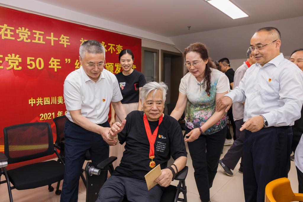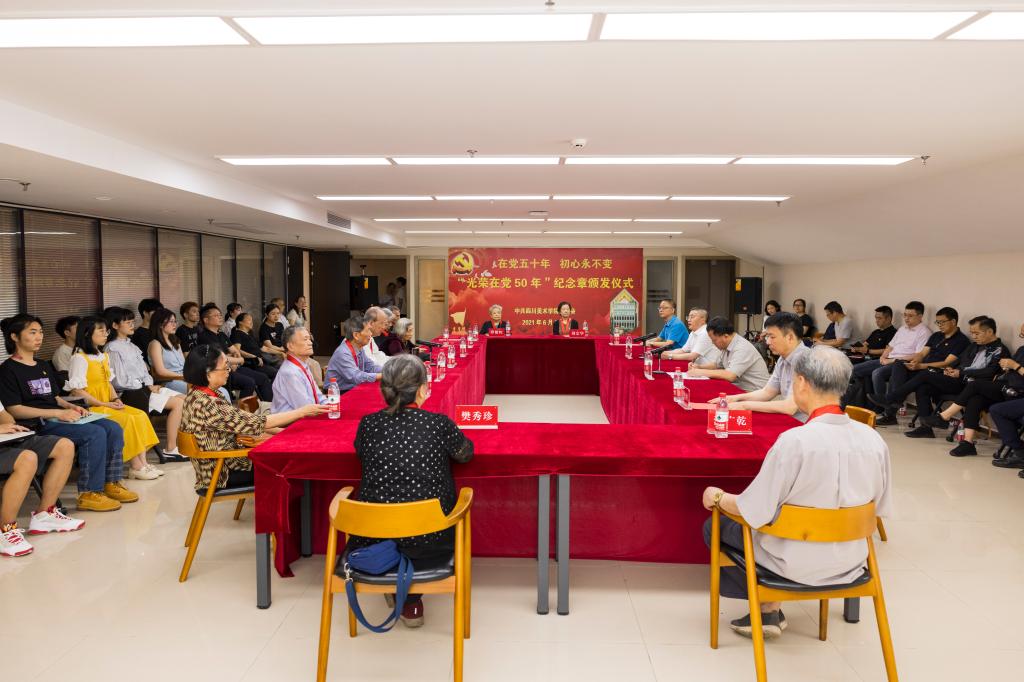 共有27名老党员获得“光荣在党50年”纪念章。他们是党员的楷模,是川美人的榜样!黄云宣读《“光荣在党50年”纪念章获得者名单》。唐青阳向所有获得“光荣在党50年”纪念章的党员同志表示热烈的祝贺和崇高的敬意,并为现场参会的11位纪念章获得者代表逐一颁发了纪念章。