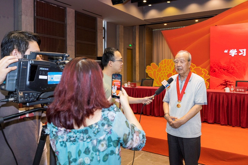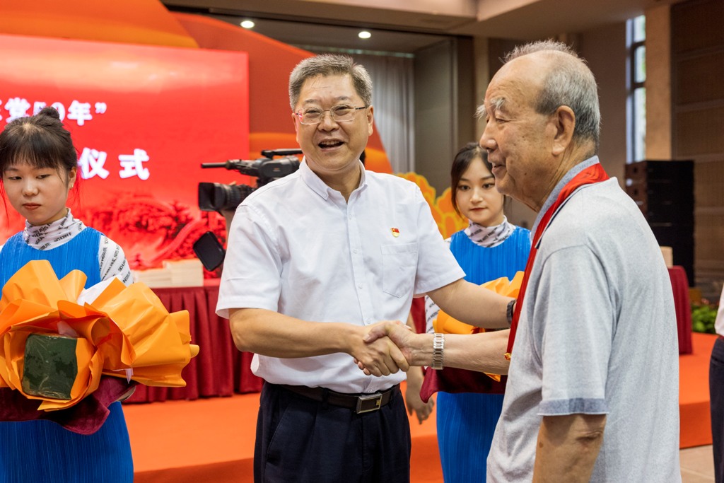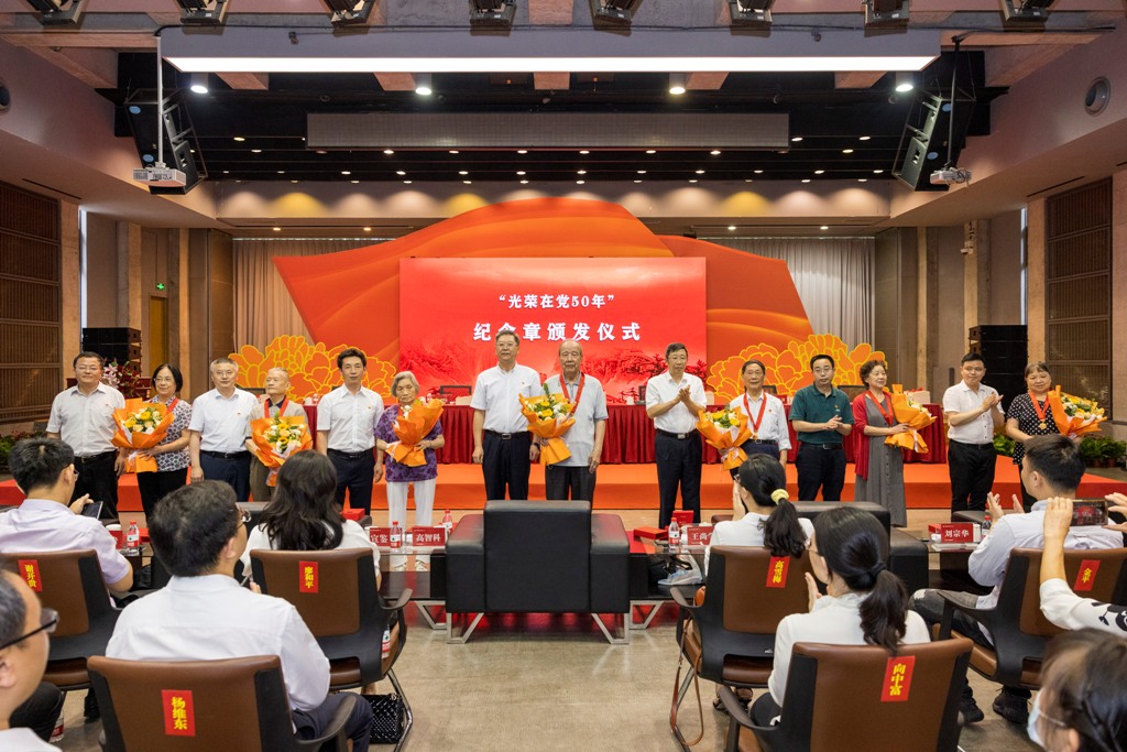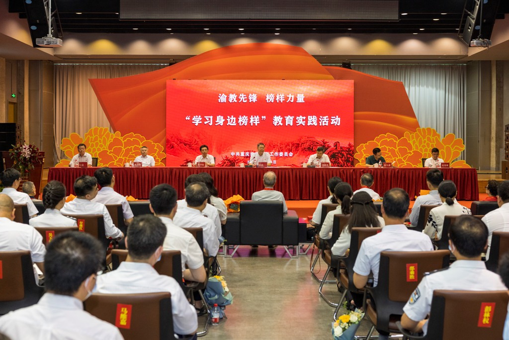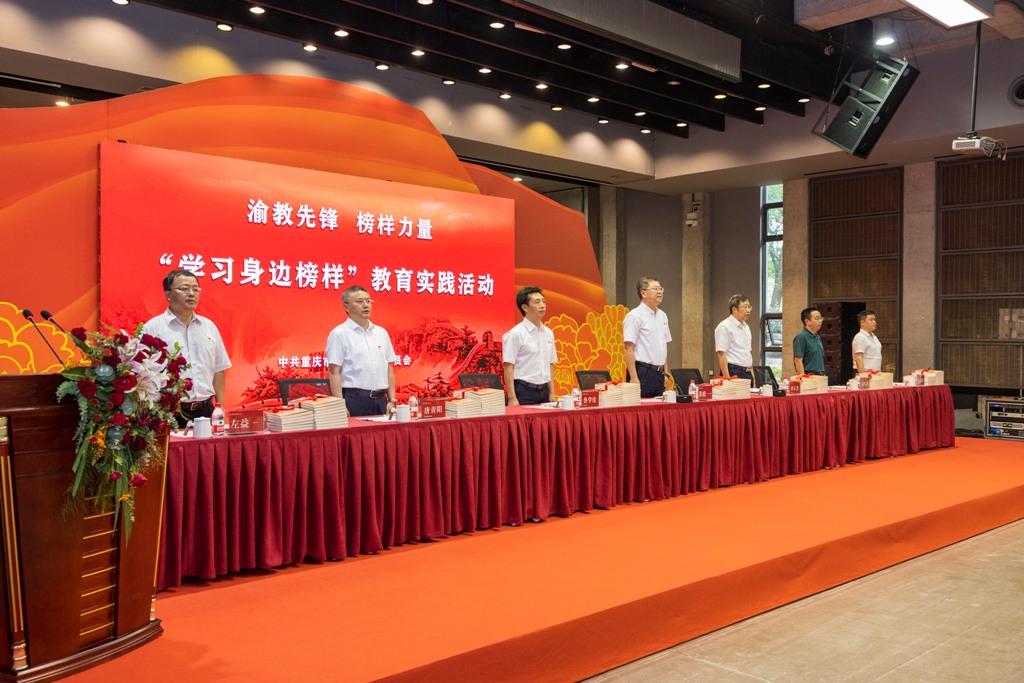 6月24日下午,重庆市委教育工委在我校大学城校区多功能厅举行“学习身边榜样”教育实践活动。老党员和新发展大学生党员代表重温了入党誓词,为有关高校党龄50年以上的老党员同志代表颁发了“光荣在党50年”纪念章,向身边榜样代表赠送了《渝教先锋 榜样力量——重庆教育100个榜样访谈录(上册)》。市委教育工委书记、市教委主任黄政领誓并讲话。 、重庆师范大学党员师生代表围绕“庆祝建党100周年,学习身边榜样”作发言。