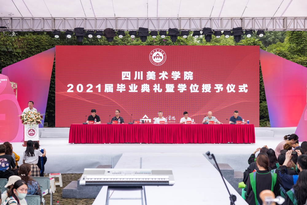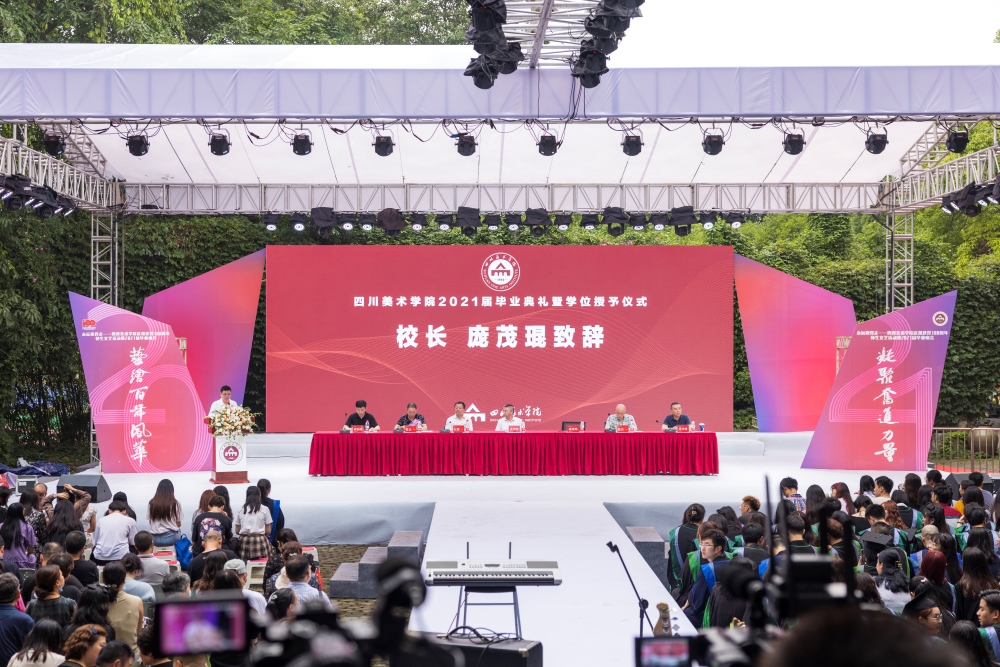 毕业典礼在庄严雄壮的国歌声中拉开序幕。校长庞茂琨首先代表学校领导致辞。向毕业生圆满完成学业致以热烈的祝贺,向陪伴同学们一路走来的老师和家长们致以诚挚的感谢。他寄语毕业生们,希望同学们坚持从党史和校史中汲取营养和智慧,与时偕行,从历史中塑造完美自我,在家国情怀中勇担历史重任。希望同学们深入生活,坚持以人民中心的创作导向,坚持用艺术美化人生,坚持用艺术奉献人民造福社会。希望同学们坚持与新时代同向同行、奋力前进,为时代的进步和民族的复兴贡献一份力量,肩负一份责任。