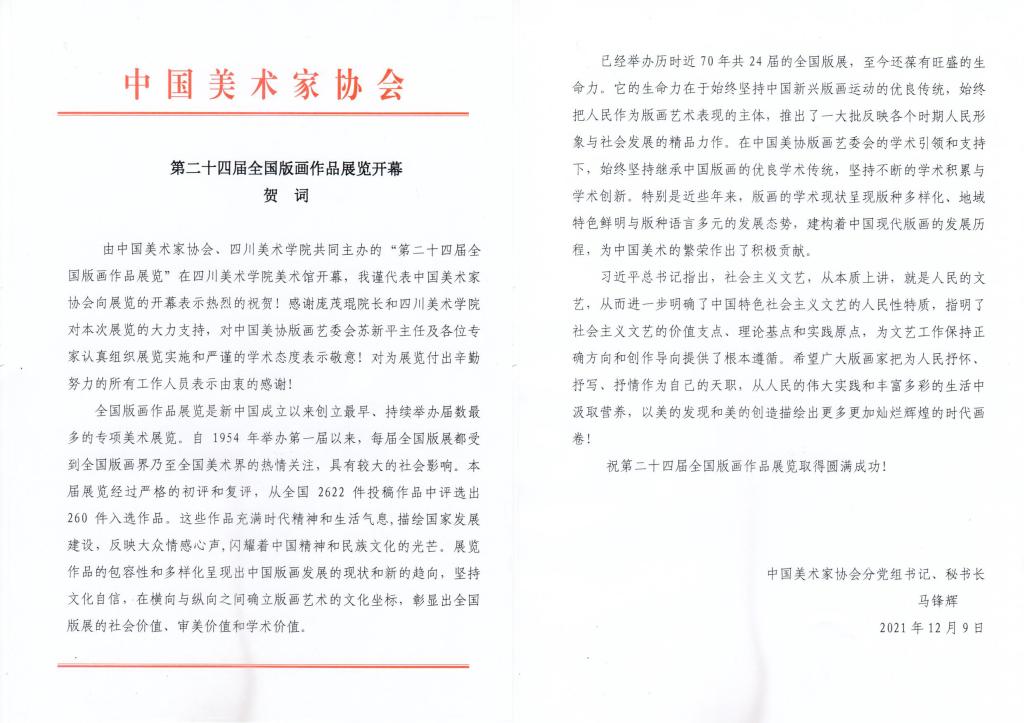 中国美术家协会分党组书记、秘书长马锋辉为本次展览开幕式发来贺信。贺信表示,已经举办近70年、共24届的全国版画展,至今还葆有旺盛的生命力。它的生命力在于它始终坚持中国新兴版画运动的优良传统,始终把人民作为版画艺术表现的主体,推出了一大批反映各个时期人民形象与社会发展的精品力作。在中国美协版画艺委会的学术引领和支持下,始终坚持继承中国版画的优良学术传统,坚持不断的学术积累与学术创新。特别是近些年来,版画的学术现状呈现版种多样化、地域特色鲜明与版种语言多元的发展态势,建构着中国版画的发展历程,为中国美术的繁荣做出了积极贡献。习近平总书记指出,“社会主义文艺从本质上讲就是人民的文艺”的重要论述,进一步明确了新时代中国特色社会主义文艺的人民性特质,指明了社会主义文艺的价值支点、理论基点和实践原点,为文艺工作保持正确方向和创作导向提供了根本遵循。广大版画家要把为人民抒怀、抒写、抒情作为自己的天职,从人民的伟大实践和丰富多彩的生活中汲取营养,以美的发现和美的创造描绘出更多更加灿烂辉煌的时代画卷!