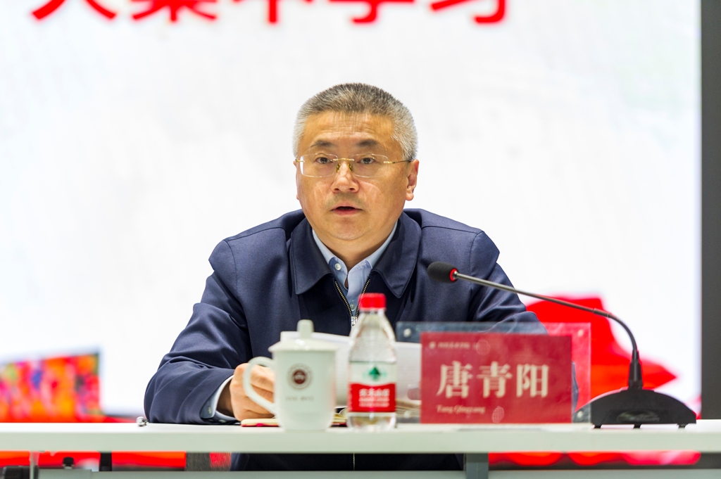唐青阳结合学校实际,就如何深入学习宣传贯彻习近平法治思想,并以习近平法治思想为指导推动全面依法治校,提出三点意见:一要提高站位强认识。学校各级党组织要把深入学习宣传贯彻习近平法治思想作为重大政治任务,与深入学习贯彻党的十九届六中全会精神结合起来,与党史学习教育结合起来。要坚持党员干部带头,多形式多渠道多层次开展学习。二要丰富形式浓氛围。要大力宣传习近平法治思想,充分发挥课堂主渠道作用,将以习近平法治思想为核心的法治教育融入思政课程,纳入师生普法教育;要充分发挥新媒体宣传作用,线上线下多形式宣传,深入开展法治文化建设,不断增强师生员工法治意识、法治观念。三要明确责任抓落实。要坚决贯彻习近平法治思想的各项要求,进一步理清依法治校工作职责,切实把依法治校作为学校治理的基本理念和基本方法,融入贯穿工作全过程、各方面,以法治思维和法治方式引领、推动、保障学校“十四五”高质量发展,努力把习近平法治思想转化为推进依法治校的生动实践,为学校“十四五”发展开好局起好步和实现“国内一流、国际知名的美术院校”的目标提供坚实保障,以优异成绩迎接党的二十大召开。
