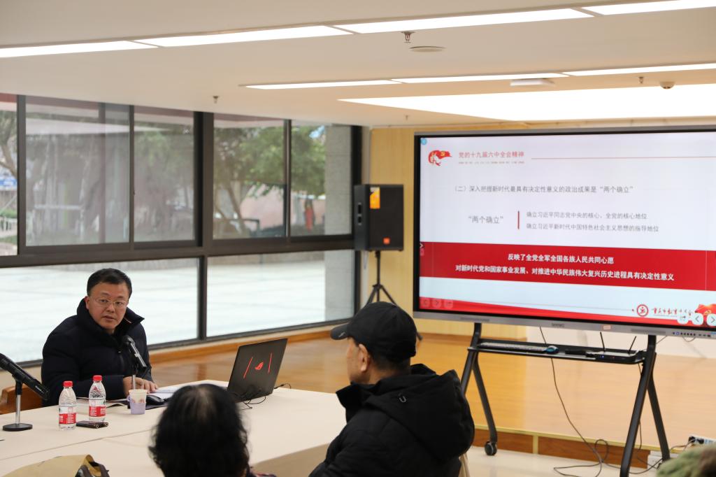 为全面深入学习领会党的十九届六中全会精神,12月27日下午,学校学习贯彻党的十九届六中全会精神宣讲队成员、党委副书记左益到黄桷坪校区,为离退休老同志和公共艺术学院党员和师生专题宣讲党的十九届六中全会精神。部分离退休老同志、公共艺术学院班子成员、教师代表、学生党员代表、离退休处负责人参加了宣讲会。会议由雍朝永主持。