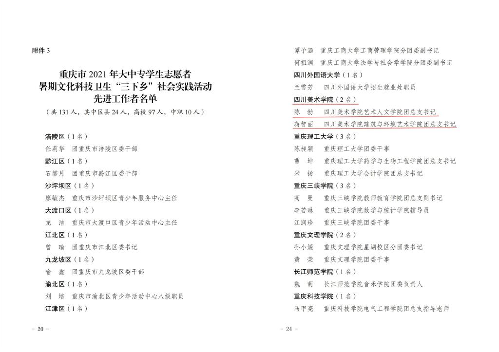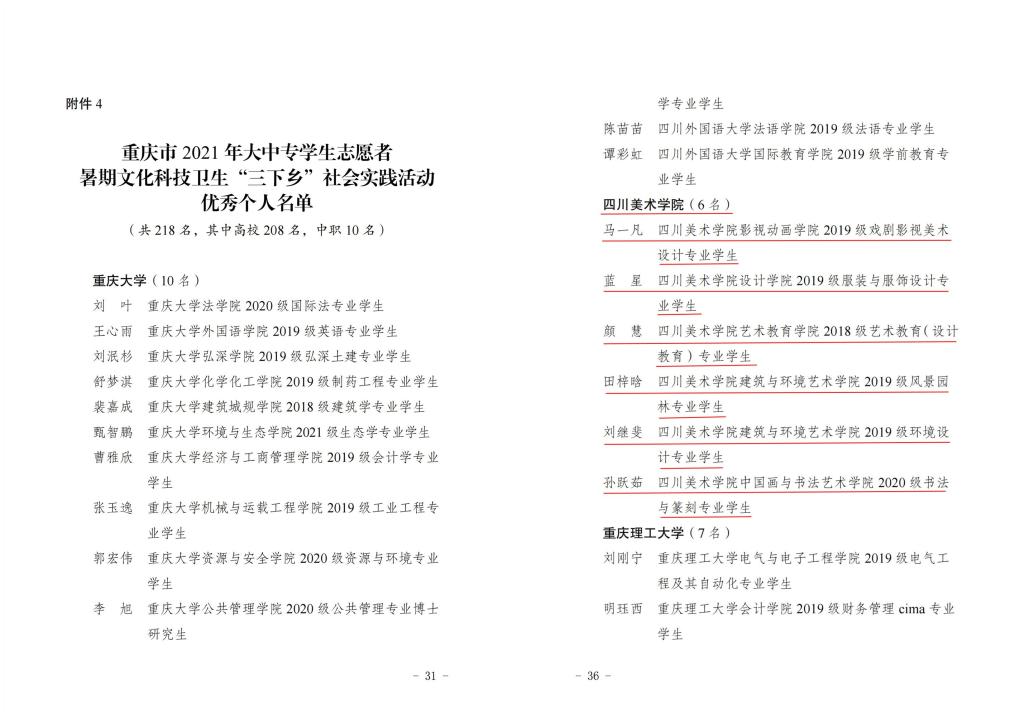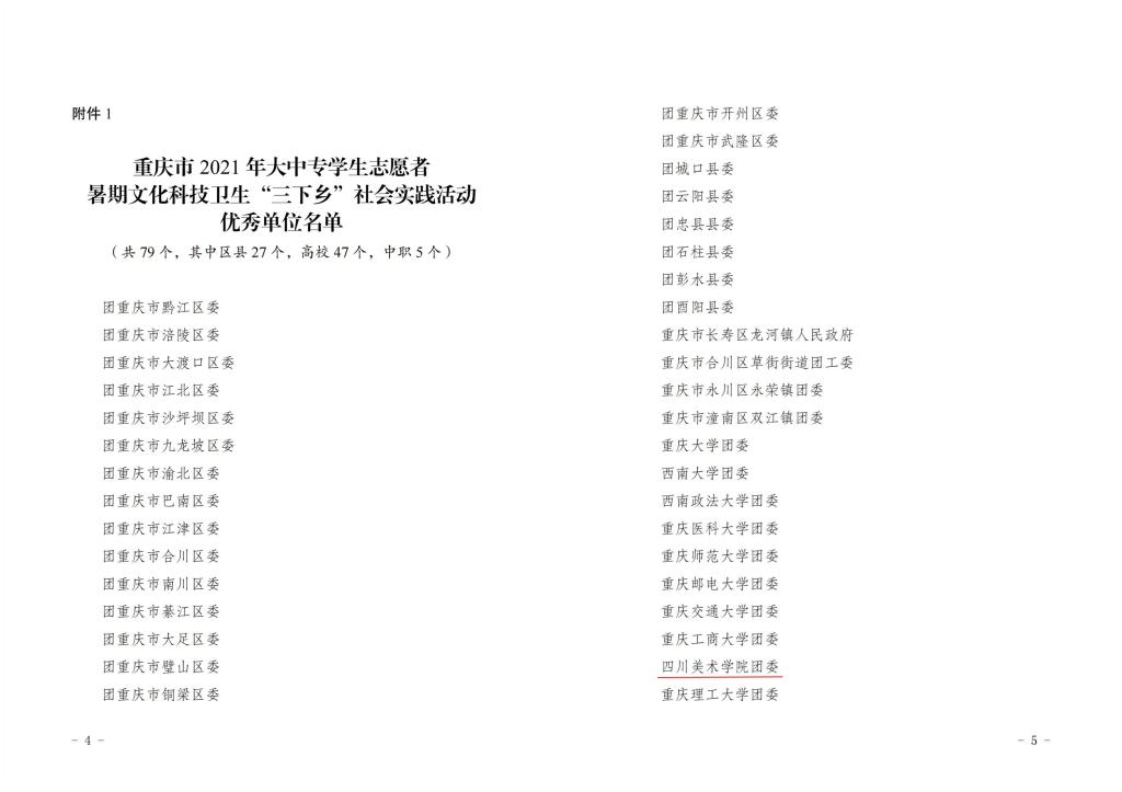 近日,在重庆市2021年暑期“三下乡”社会实践活动评比中,我校获得12项表彰。其中,学校团委获得“优秀单位”称号;影视动画学院“美丽乡村-艺梦同行”乡村振兴实践团、设计学院“青山艺梦”乡村振兴实践团、艺术教育学院“艺·中益”中益乡乡村美育团队共3支团队获得“优秀团队”称号;艺术人文学院团总支书记陈勃、建筑与环境艺术学院团总支书记蒋智丽获得“先进工作者”称号;田梓晗、马一凡、蓝星、颜慧、刘继斐、孙跃茹等6名同学获得了“优秀个人”称号。