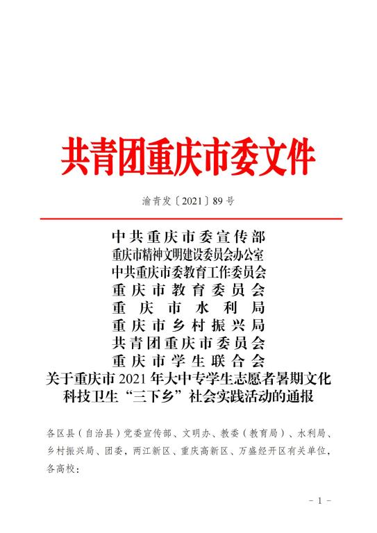 今年 7 至 10 月,根据中央宣传部、中央文明办、教育部、共青团中央、全国学联《关于开展 2021 年全国大中专学生志愿者暑期文化科技卫生“三下乡”社会实践工作的通知》整体部署,团市委联合市委宣传部、市文明办、市委教育工委、市教委、市水利局、市乡村振兴局等单位以“永远跟党走 奋进新时代”为主题,以庆祝中国共产党成立 100 周年为契机,启动了2021 年重庆市大中专学生志愿者暑期文化科技卫生“三下乡”社会实践活动。