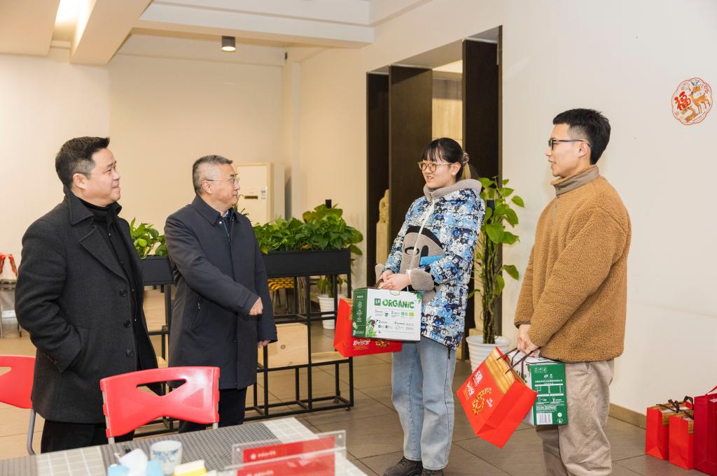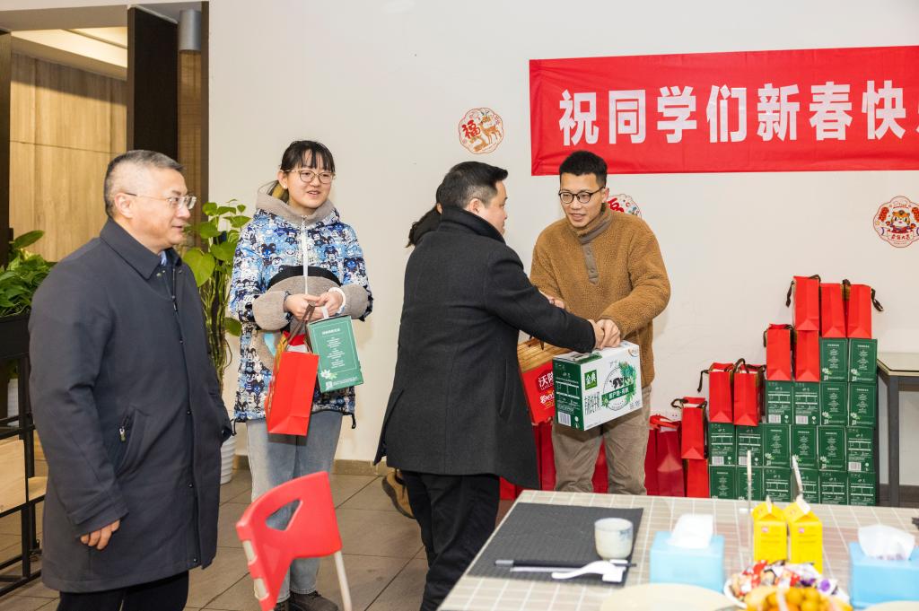 校领导为留校学生发放了新春礼包,并送上新春祝福。唐青阳、庞茂琨亲切慰问寒假留校学生,祝愿大家虎年吉祥、学习进步。唐青阳、庞茂琨、左益、焦兴涛、段胜峰与同学们深入细致交流,详细询问了解同学们留校期间学习、生活等情况,叮嘱他们合理安排寒假生活,在校园里度过一个平安祥和充实的春节。