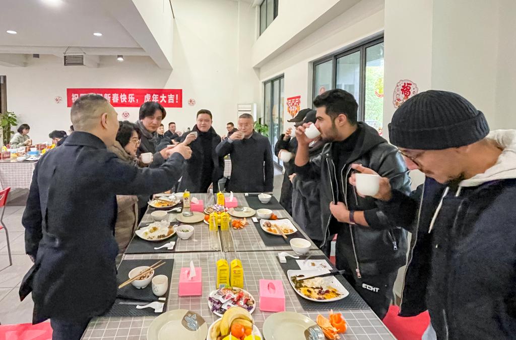 1月30日中午,除夕夜前日,学校党委书记唐青阳,党委副书记、校长庞茂琨,党委副书记左益,副校长焦兴涛,副校长段胜峰,与党政办、学生处、研究生处、国际交流合作处、团委、保卫处、基建后勤处和相关二级学院负责人一起,陪同因疫情原因无法回家过年的寒假留校学生共进团年饭。