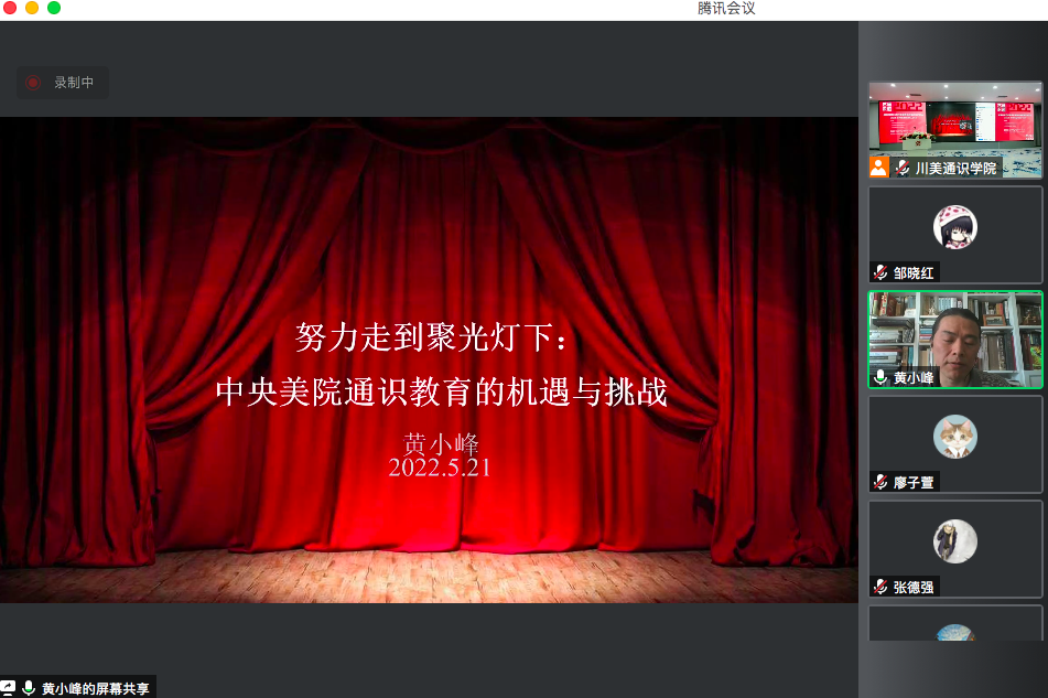 下午两点,会议第三阶段继续进行,五位发言专家分别是:吉林艺术学院公共基础部主任张旭、湖北美术学院公共课部主任周捷峰、南京艺术学院文学教学部主任张德强、鲁迅美术学院大连校区人文学院院长曹天慧以及 通识学院英语教研室主任肖红。发言题目分别为:《新文科视野下专业艺术人才培养中通识教育的创新维度》《学习贯彻习近平总书记教育重要论述,加强美术院校通识课程“供给侧”改革——关于湖北美术学院公共课部通识课程改革的探索与思考》《通识教育 线上线下——以大学文学课程为例》《基于素质与兴趣培养的艺术设计史论通识课教育》《构建分层级多元化的课程体系,培养语言+艺术的国际化人才》。