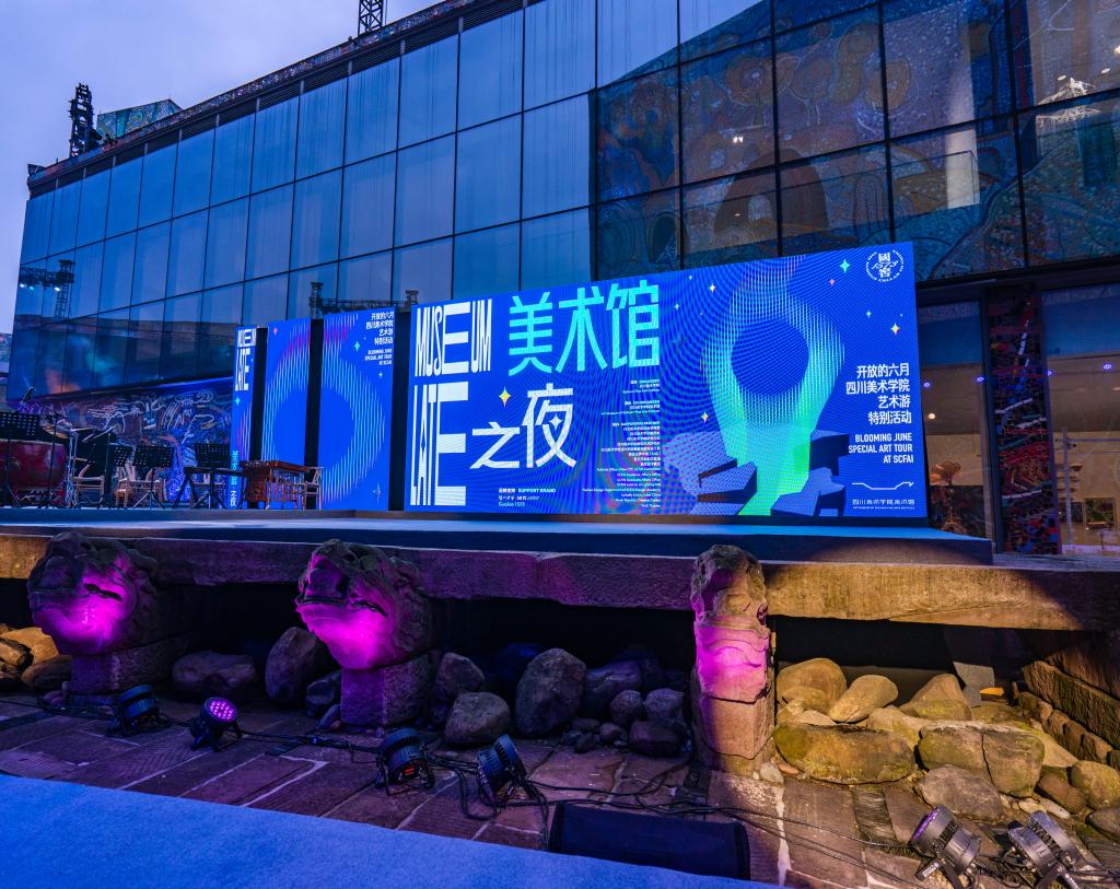 6月9日晚20:00,“美术馆之夜——开放的六月- 艺术游特别活动”在 美术馆开幕。泸州老窖-国窖1573携手我校,与音乐共和创艺聚场、寅子剧场一起,带来跨界试听表演晚会,推出灯光秀、服装秀、国潮音乐剧、沉浸式戏剧四大版块节目。