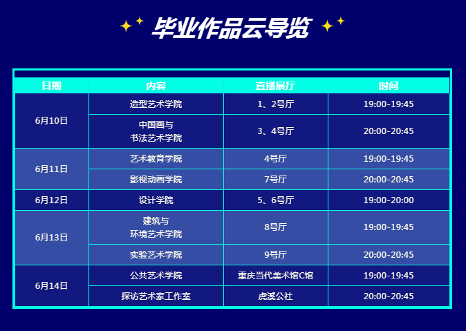6月10日至14日,在教务处统筹和各二级学院的支持下,通过上游新闻、雅昌艺术等媒体平台,推出了毕业作品云导览,以线上直播的方式,为观众解读和呈现了2022“开放的六月”毕业展的特色和亮点,有效地弥补了线下展览拓展的有限性,促进毕业实践教学与社会平台、公众的积极联动。