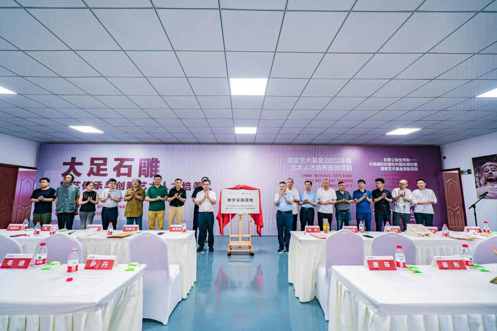 最后,在众嘉宾和学员的见证下由唐青阳书记、张明部长为教学实践基地揭牌,唐青阳宣布国家艺术基金2022年度艺术人才培养资助项目《大足石雕技艺传承与创新艺术人才培养》开班。