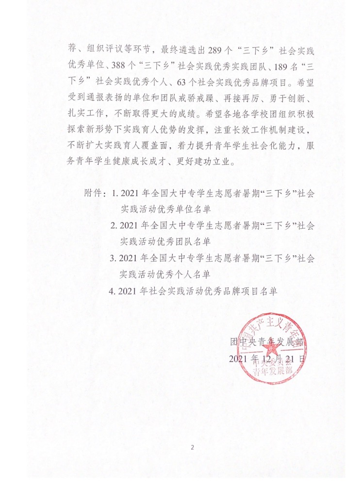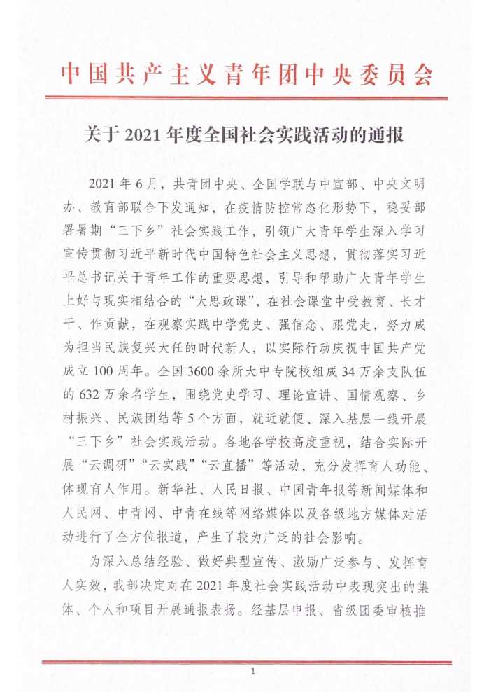 近日,团中央下发《关于2021年度全国社会实践活动的通报》对在2021年暑期社会实践工作中表现突出的先进集体和个人进行了通报表扬。我校团委吴倩同志被评为“2021年全国大中专学生志愿者暑期‘三下乡’社会实践活动优秀个人”。