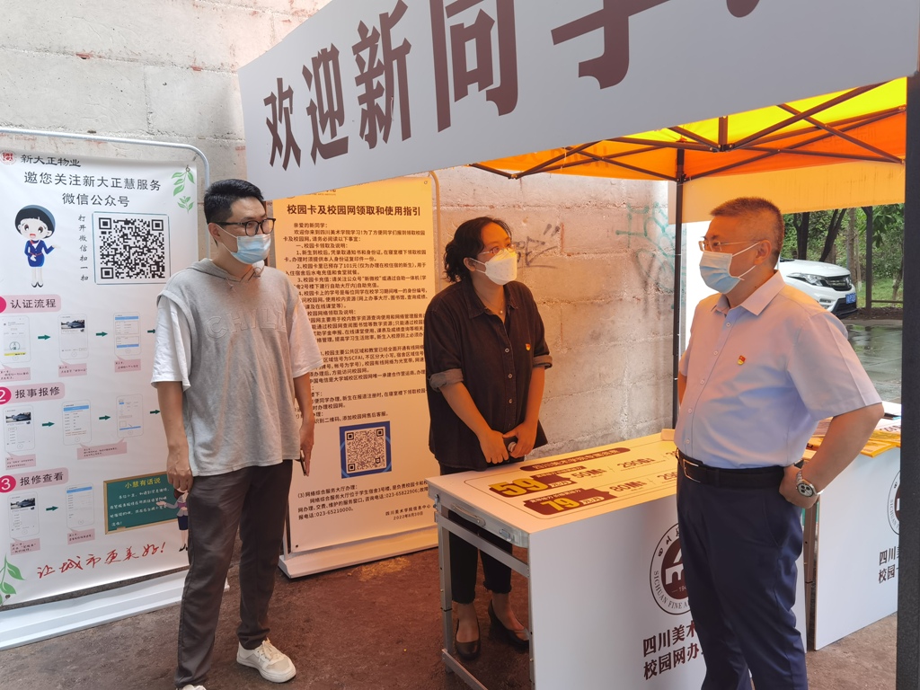 2022年9月1日,金秋送爽,秋雨纷飞,是 喜迎来自全国各地的2022级新生报到的日子。学校领导一大早来到大学城校区的南门、西门以及黄桷坪校区大门,在雨中热情迎接新同学们的到来,并在迎新现场与新生及其家长、现场工作人员、教职工党员志愿者们亲切交谈。