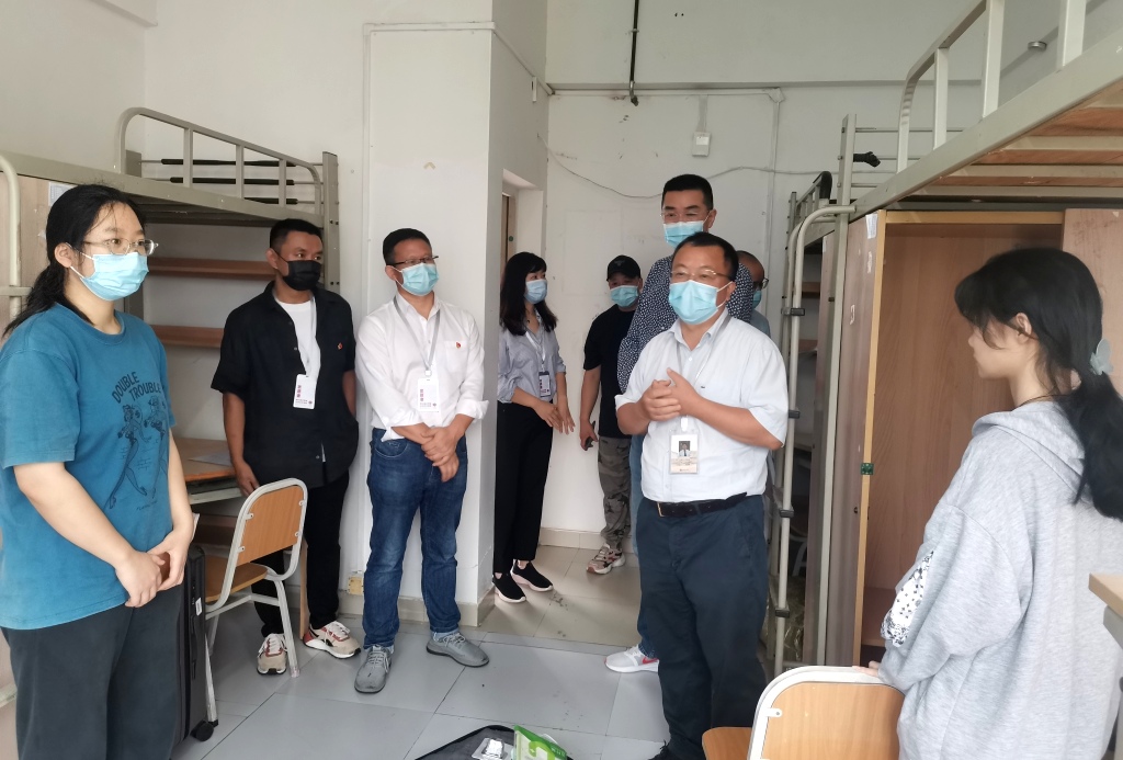 党委书记唐青阳,党委副书记、校长庞茂琨逐一走访每栋学生寝室,叮嘱新同学们在学校安心生活和学习,入校第一天虽然大家在寝室封闭管理,但学校会全力配合同学们的需求,做好各项后勤服务保障工作,我们师生一起迎难而上。唐青阳对辛勤坚守在迎新一线的教职工志愿者队伍的担当和为学校疫情防控工作所作的积极贡献表示肯定,对他们的辛苦付出表示衷心感谢。