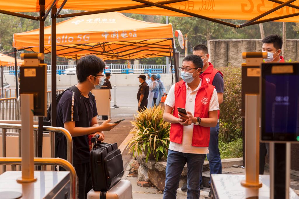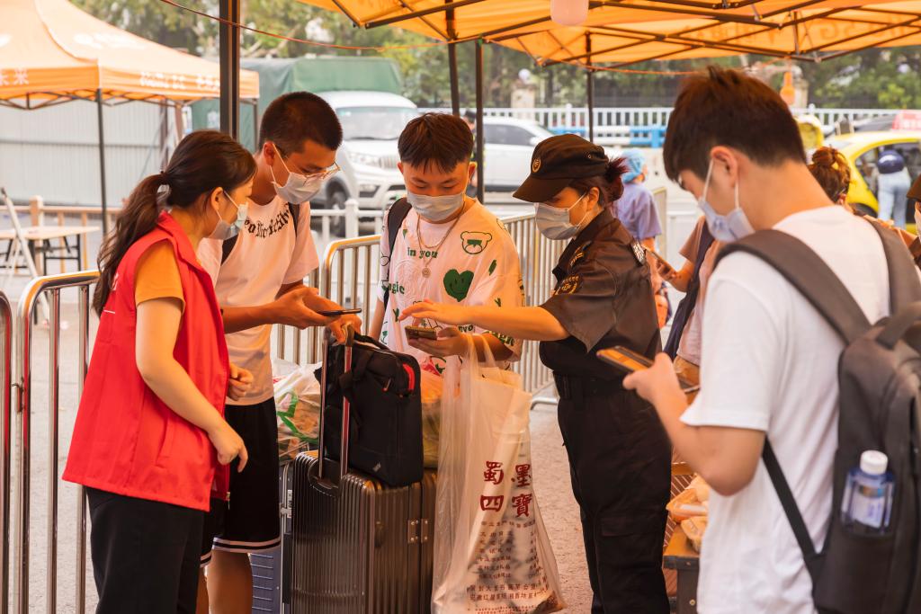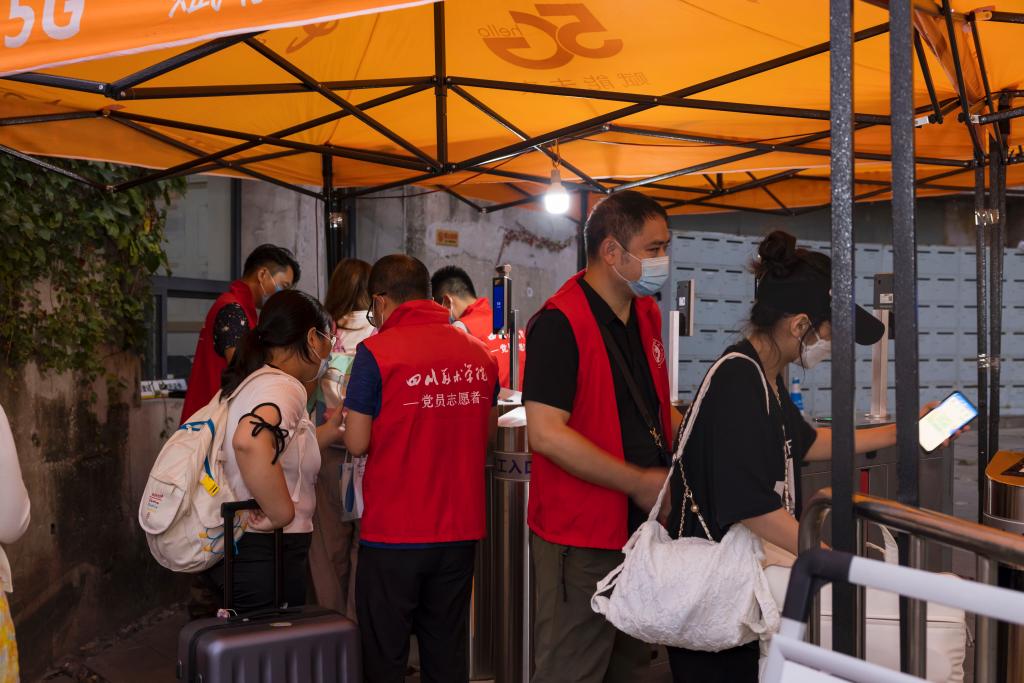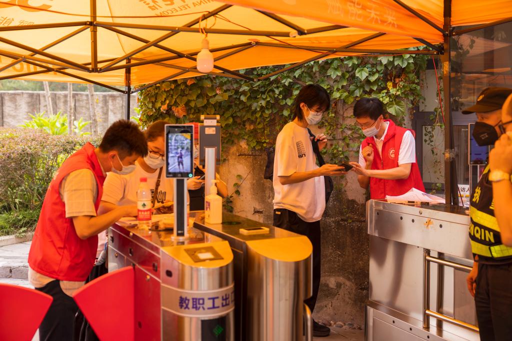 他们分工明确、条理清晰、面带微笑,坚守在自己的志愿服务岗位上,积极协助物业服务中心的工作人员们,认真、高效地完成每一位返校学生的进校程序,同时为同学们提供热情的服务和帮助。有的老师与保安人员一起,检查返校学生的两码和48小时核酸阴性报告;有的老师负责登记两码异常的学生信息,并核实原因,及时与学生处联系报告情况;有的在进校闸机口为学生测量体温,引导学生通过“川美一码通”扫码入校;有的在核酸检测点采集信息、维持秩序,确保每一位返校学生入校即检,并提醒同学们参加完核酸采样后,即刻入住学生宿舍;有的老师全程耐心细致地回答返校同学们的疑问和咨询。